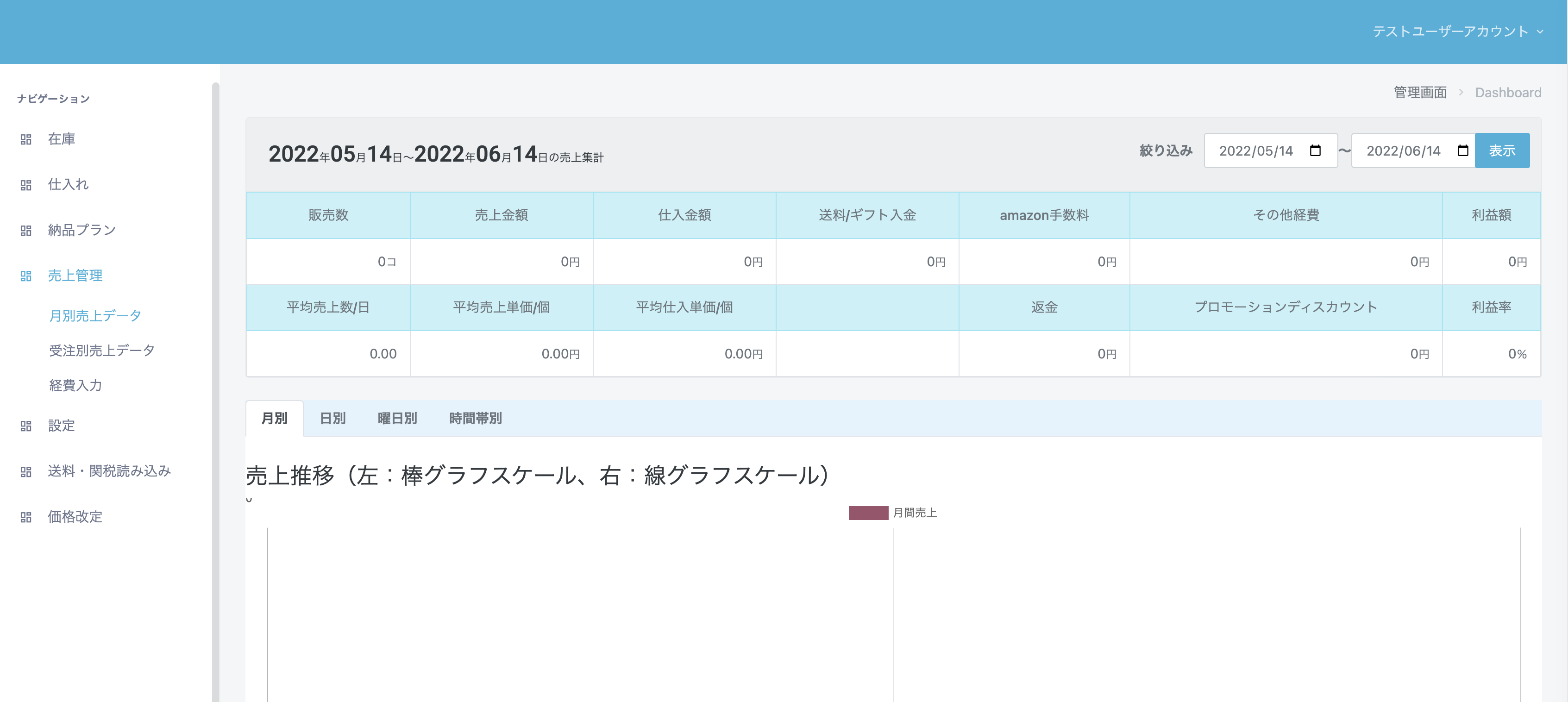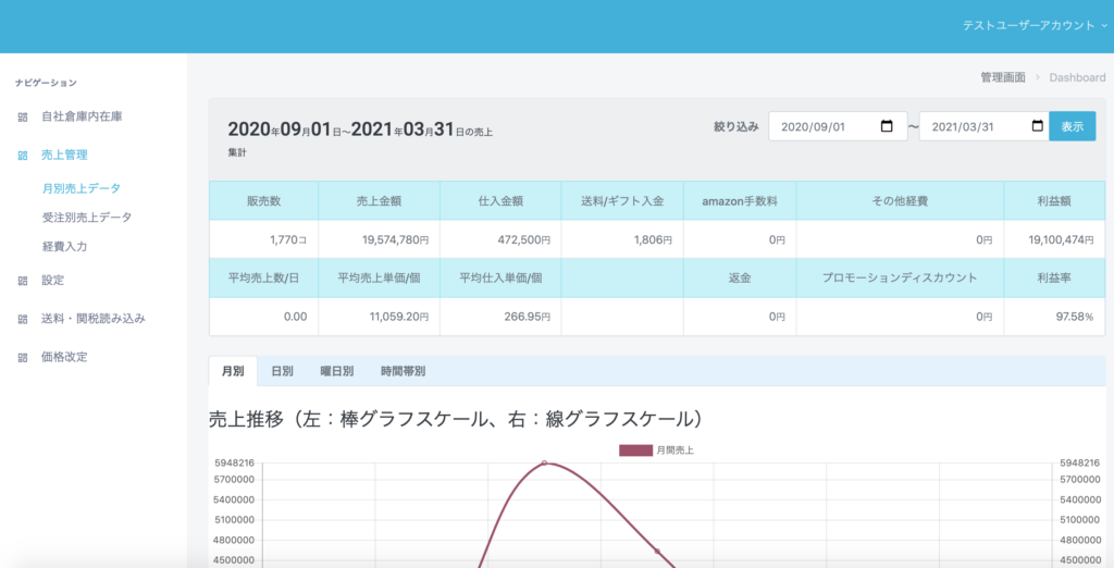 販売管理ツール AmazonFBAで販売したデータを元に、月単位で売上管理ができます。また、商品データ登録と現在の在庫データを元に在庫管理ができ、適切な仕入れ数の管理に役立ちます。 お申し込みはこちらのフォームから
